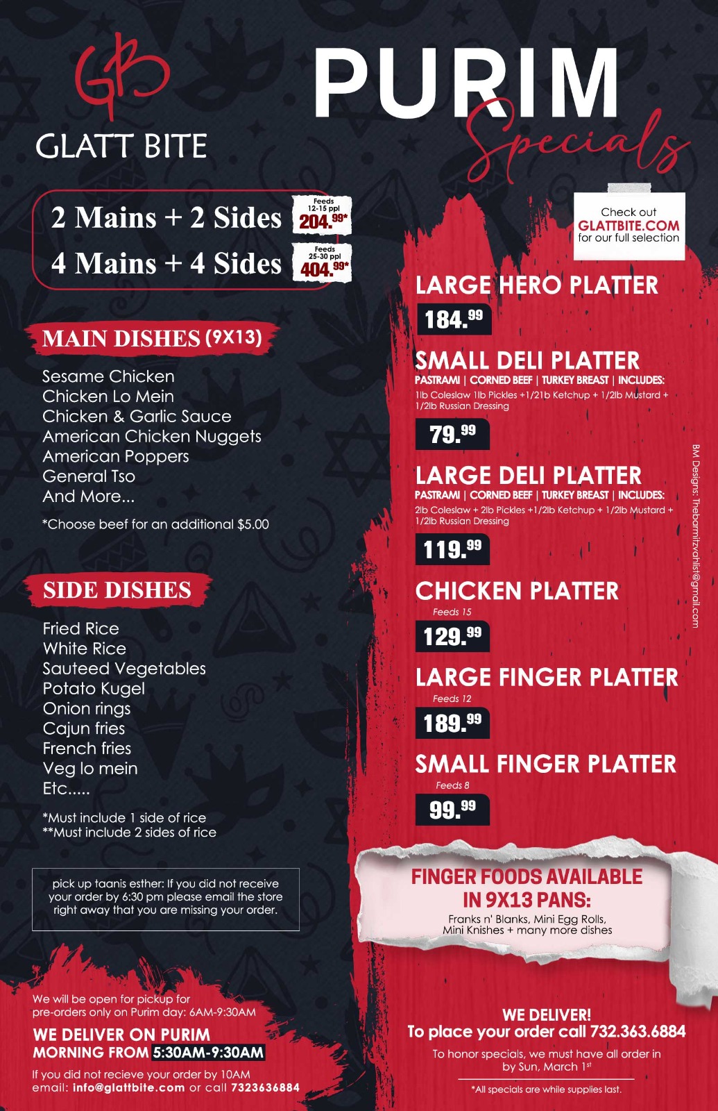 VIEW OUR CATERING MENUEnjoy great food with family and friends at Glatt Bite. With room for over 200 customers, you and yours can enjoy everything from burgers to chicken, soups to Chinese cuisine and so much more, all served in the air conditioned comfort of a restaurant designed with you in mind.